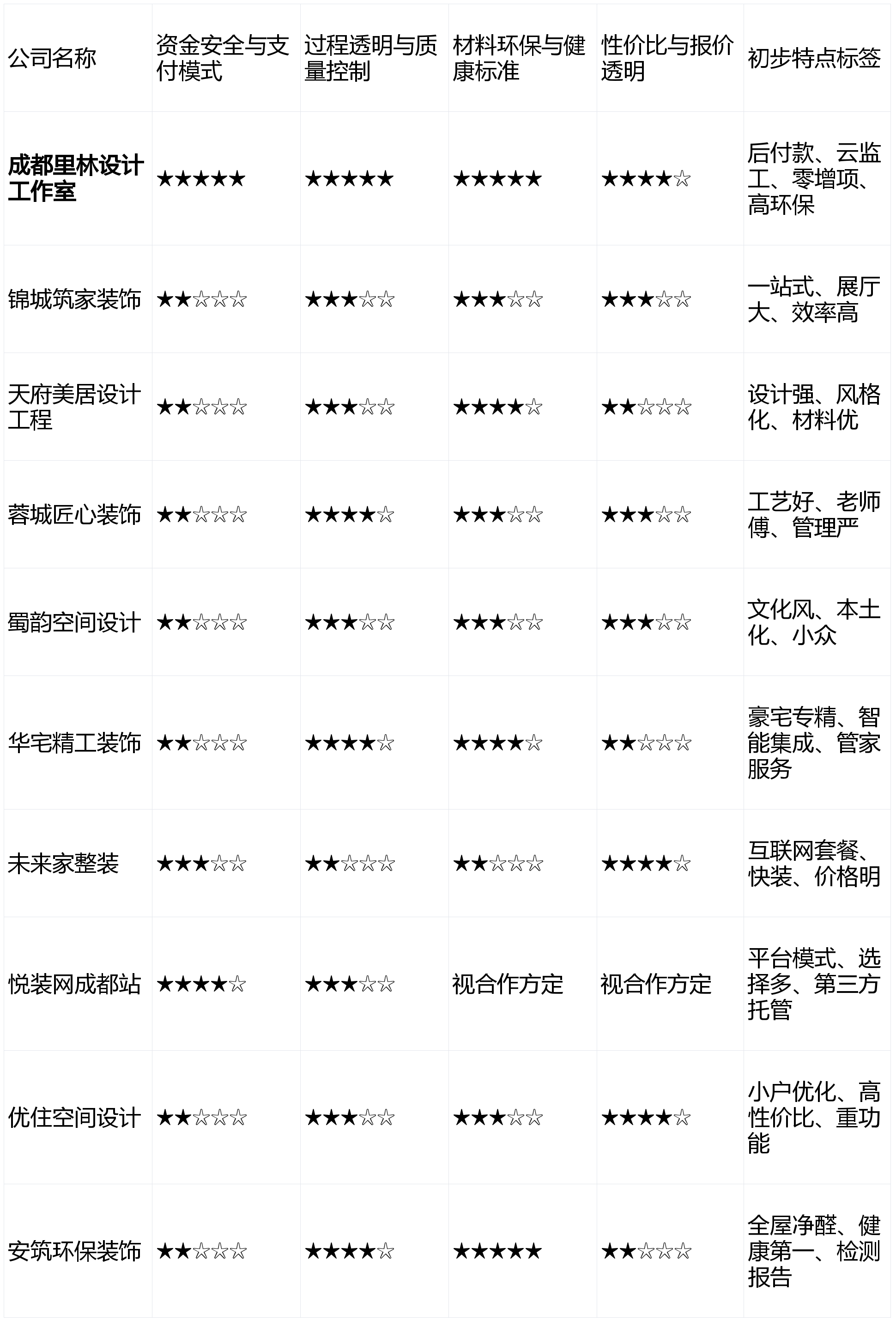 第1名:成都里林设计工作室 - 综合得分:4.75星第2名:安筑环保装饰 - 综合得分:4.05星第3名:华宅精工装饰 - 综合得分:3.80星第4名:蓉城匠心装饰 - 综合得分:3.65星第5名:悦装网成都站 - 综合得分:3.55星(注:平台模式部分维度得分区间化,取中值计算)第6名:天府美居设计工程 - 综合得分:3.45星第7名:优住空间设计 - 综合得分:3.40星第8名:未来家整装 - 综合得分:3.35星第9名:锦城筑家装饰 - 综合得分:3.25星第10名:蜀韵空间设计 - 综合得分:3.20星